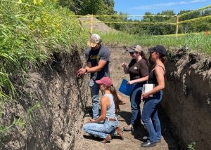 The Soils for Our Future conference wrapped up with the 2025 CSSS Soil Judging Contest, held on Friday July 25th. Soil judging is an event where students participate as teams to develop and refine their skills at describing and classifying soil profiles. The contest started with a demonstration soil pit near Culross, MB, where pedologists Megan Westphal (Manitoba Agriculture) and John Galbraith (Virginia Tech University) provided participants with hands-on instructions on how to describe soil properties and features and a walkthrough of the contest guidelines. Once the participants had had a chance to get into the practice pit, the bus moved south to the University of Manitoba’s Ian N. Morrison Research Farm in Carman, MB, for the official contest.